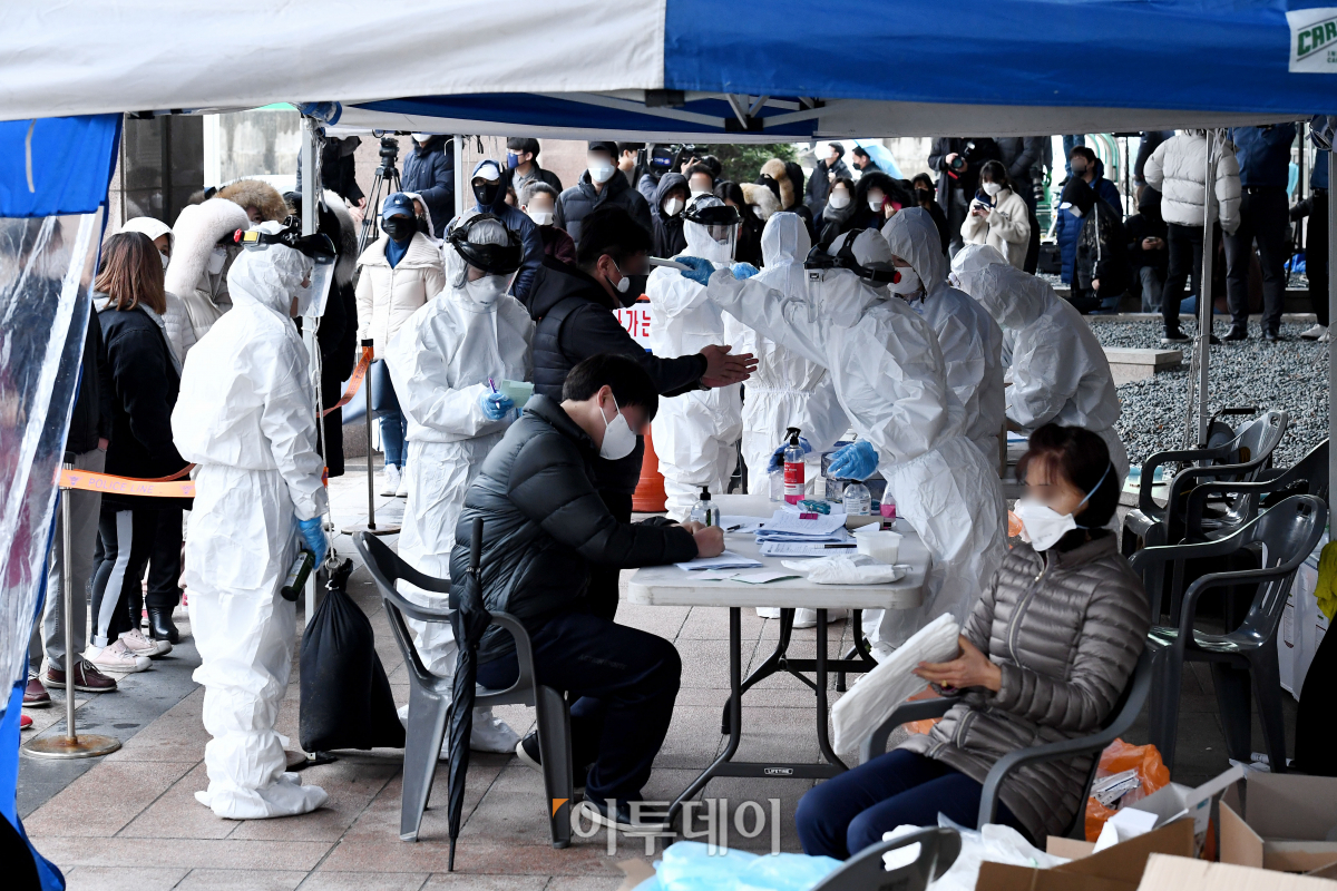 서울 구로구 신도림동 코리아빌딩 11층 콜센터에서 신종 코로나바이러스 감염증(코로나19) 집단 감염으로 최소 30명 이상의 확진자가 발생했다. 이는 서울에서 발생한 최대규모 집단 감염이다. 10일 이 건물 앞에 설치된 선별진료소에서 시민들이 검체 검사를 받고 있다. 신태현 기자 holjjak@