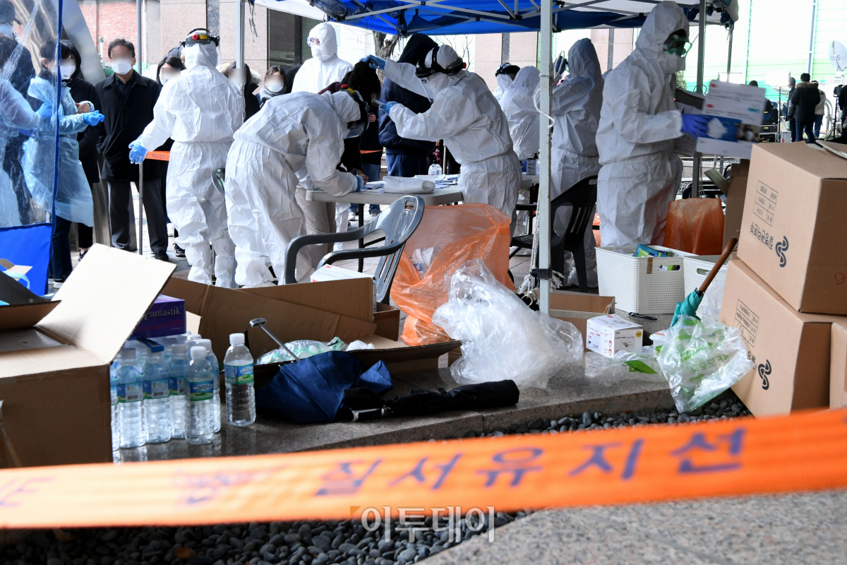 서울 구로구 신도림동 코리아빌딩 11층 콜센터에서 신종 코로나바이러스 감염증(코로나19) 집단 감염으로 최소 30명 이상의 확진자가 발생했다. 이는 서울에서 발생한 최대규모 집단 감염이다. 10일 이 건물 앞에 설치된 선별진료소에서 시민들이 검체 검사를 받고 있다. 신태현 기자 holjjak@