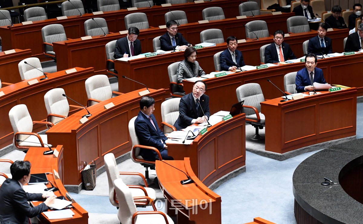 홍남기 부총리 겸 기획재정부 장관이 11일 서울 여의도 국회에서 열린 신종 코로나바이러스 감염증(코로나19) 대응 추경안 심사를 위한 예산결산특별위원회 종합정책질의에서 의원의 질의에 답하고 있다.