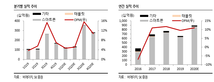 이동주 SK증권 연구원은 “이 회사는 북미 고객사 모바일 신제품 사이클과 연동되기 때문에 상반기 29%, 하반기 71%로 실적의 상저하고가 뚜렷하다”며 “특히 올해 하반기는 신제품 내 OLED 침투율 확대와 판가 상승이 유력한 가운데 상반기는 코로나 19 영향으로 고객사 생산 차질이 빚어지고 있어 매출 의존도는 더욱 높아질 것”이라고 전망했다.