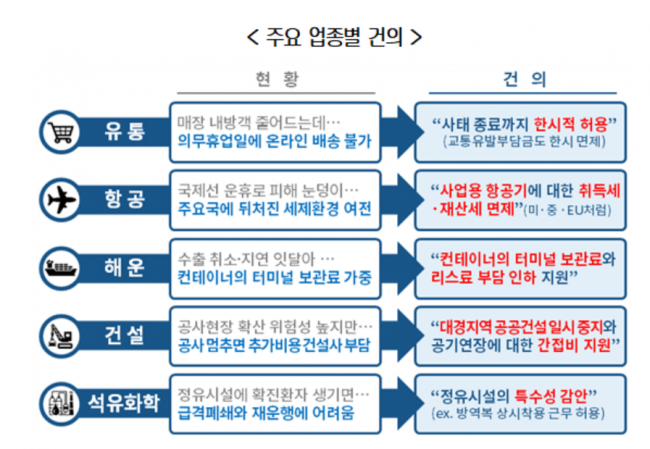항공업계도 입국제한 등의 조치로 피해가 심각한 업종이다. 국제선 운휴 등에 따른 매출 피해만 상반기 기준으로 5조 원이 넘을 것으로 예상된다. 이와 관련해 대한상의는 미ㆍ중ㆍEU(유럽연합)처럼 ‘사업용 항공기에 대한 취득세·재산세 면제’를 요청했다.