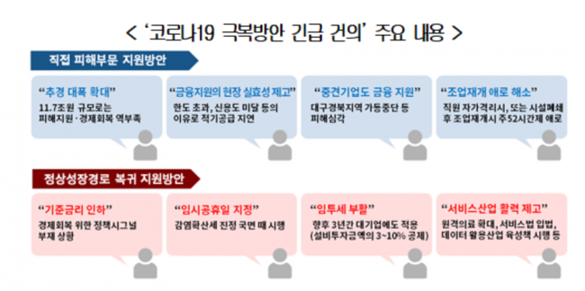 추가경정예산을 파격적으로 확충하고 업종별 대책을 마련하는 한편, 현장에서 기존 지원의 체감이 힘든 만큼 지원방법의 실효성을 높여야 한다고 주문했다.