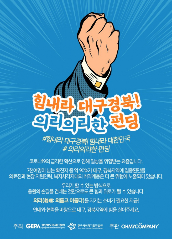 사회혁신 크라우드펀딩 플랫폼 오마이컴퍼니가 코로나19 극복을 위한 ‘힘내라! 대구경북, 의리의리한 펀딩’ 전용관을 개설해 참여 프로젝트를 모집, 운영한다.