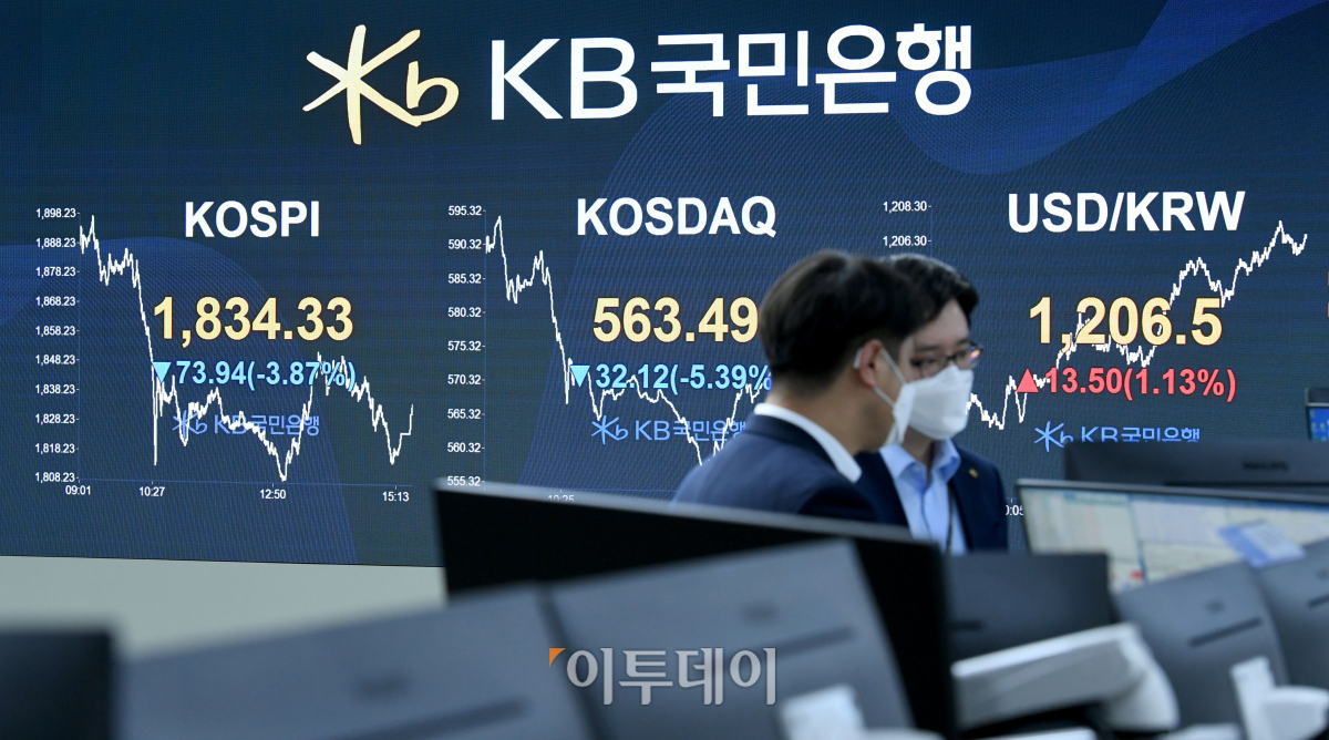 코스피 지수가 세계보건기구(WHO)의 신종 코로나바이러스 감염증(코로나19) 팬데믹(세계적 대유행병) 선언 충격에 4% 가까운 낙폭을 보이며 주저앉았다. 장중 한때 매도 사이드카가 발동되기도 했다. 12일 서울 여의도 KB국민은행 스마트딜링룸 전광판에 코스피 지수가 전 거래일보다 73.94포인트(3.87%) 내린 1834.33을 가리키고 있다. 종가 기준으로 2015년 8월 24일 1829.81를 기록한 이후로 가장 낮은 수치다.