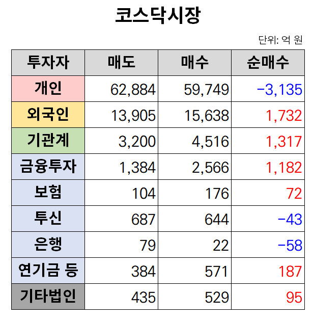 이날 외국인과 기관은 각각 1732억 원, 1317억 원어치를 순매수했다. 반면 개인은 홀로 3135억 원어치를 팔아치웠다.
