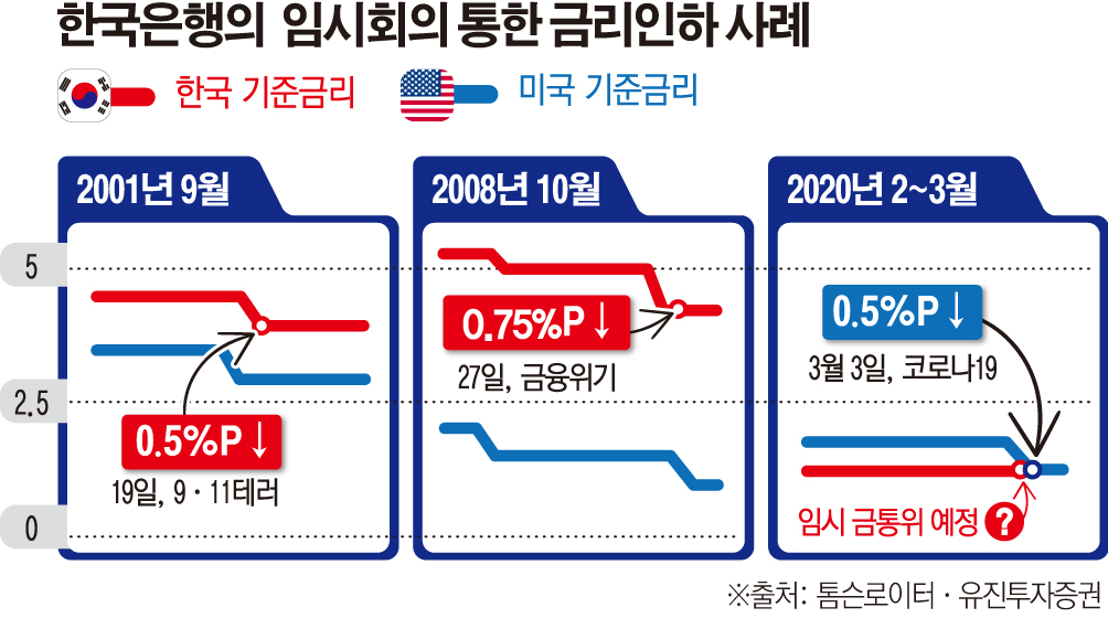 주원 현대경제연구원 경제연구실장은 “기준금리 인하가 실물경제에 미치는 영향력은 점점 줄고 있다”면서도 “(코로나19 확산) 상황이 급박해 1분기 역성장과 추경 효과 반감 등을 고려하면 임시 금통위에서 제로금리에 진입할 가능성이 높다”고 말했다.