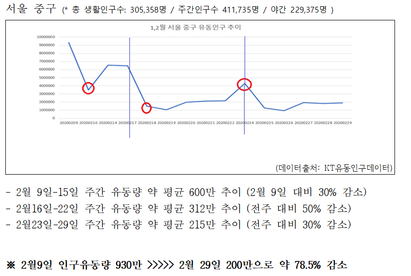 소상공인연합회 빅데이터 센터는 KT의 통신 빅데이터 플랫폼과 소상공인연합회가 수집한 600만개의 소상공인 업체 빅데이터를 바탕으로 올해 1,2월 코로나 19 사태로 인한 인구 유동량 변화 추이와 상가점포의 영향 등을 조사해 왔다.