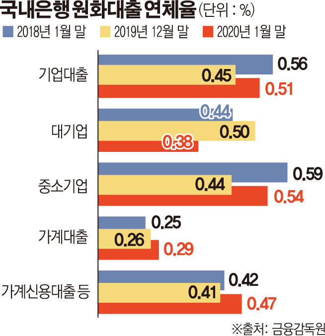차주별로 살펴보면 기업대출 연체율은 1월 말 0.51%로 전월 말 대비 0.05%p 올랐다. 구체적으로 같은 기간 중소기업 대출 연체율이 0.54%로 0.09%p 상승했고, 개인사업자 대출 연체율도 0.33%로 0.04%p 뛰었다. 대기업 대출 연체율만 0.38%를 기록하며 0.13%p 하락했다.