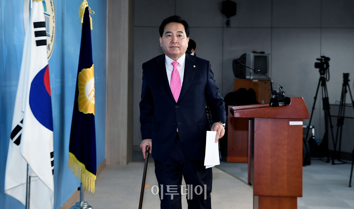 심재철 미래통합당 원내대표가 16일 서울 여의도 국회에서 기자회견을 갖고 제21대 총선에서 자신의 지역구인 경기 안양동안을 출마를 선언한 뒤 정론관을 나서고 있다.