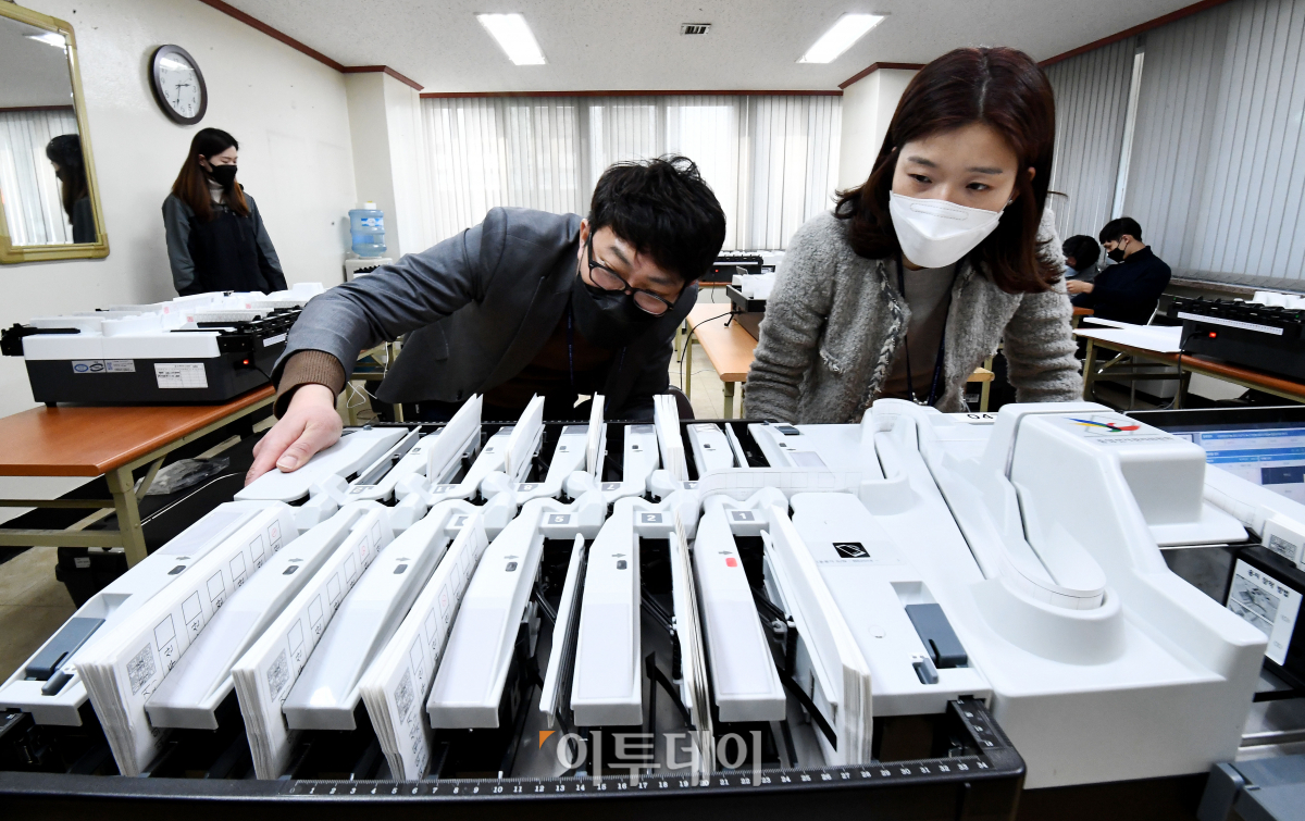 [포토] 투표지분류기 시험운영하는 서울시선관위 관계자들
