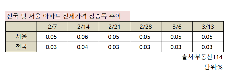 부동산114에 따르면 전국 아파트 전셋값은 지난주까지 4주 연속 0.03% 올랐다. 서울도 한 달째 0.05% 상승폭에 머물러 있다.