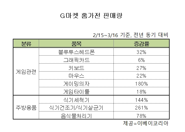 바깥 출입을 자제하면서 집에서 즐길 수 있는 게임 관련 제품 역시 인기다. 전자랜드의 PC 관련 매출은 이달 들어 16일까지 전년 동기 대비 7% 성장했다. 온라인 쇼핑몰 G마켓의 지난달 15일부터 이달 16일까지 게이밍의자 판매량은 180% 치솟았고, 키보드와 마우스, 그래픽 카드 매출도 각각 27%, 22%, 6% 증가했다. 게임타이들은 18%, 블루투스 헤드폰은 32% 늘었다.