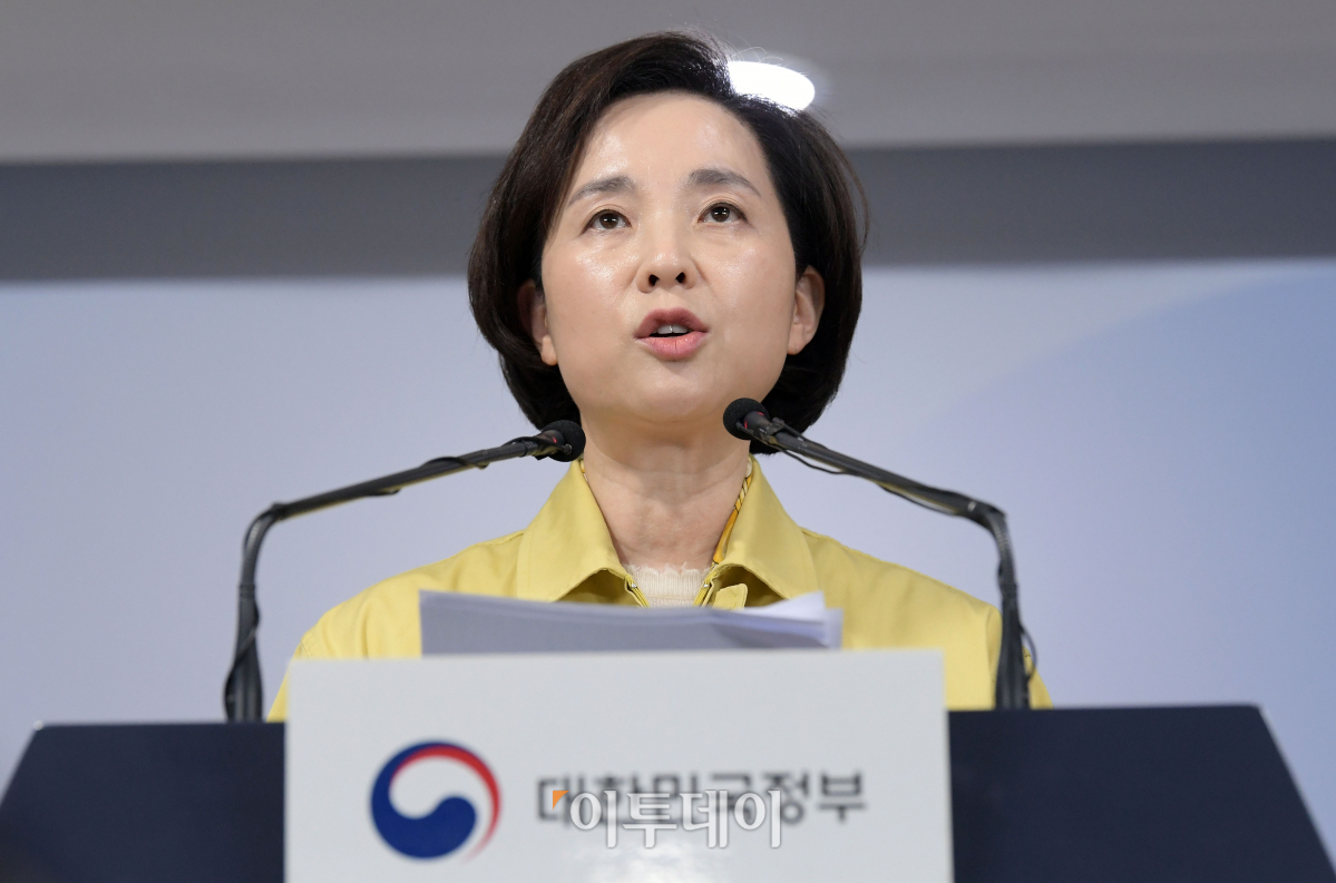 유은혜 부총리 겸 교육부 장관이 17일 서울 종로구 세종대로 정부서울청사에서 브리핑을 갖고 신종 코로나바이러스 감염증(코로나19)으로 인한 초·중·고교 3차 개학 연기 및 후속대책 등을 발표하고 있다. 이 자리에서 유 부총리는 “전국 학교의 개학을 오는 23일에서 내달 6일로 2주 더 연기한다”고 밝혔다.