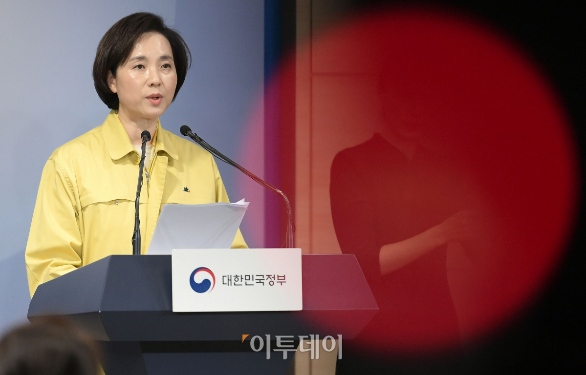 유은혜 부총리 겸 교육부 장관이 17일 서울 종로구 세종대로 정부서울청사에서 브리핑을 갖고 신종 코로나바이러스 감염증(코로나19)으로 인한 초·중·고교 3차 개학 연기 및 후속대책 등을 발표하고 있다. 이 자리에서 유 부총리는 “전국 학교의 개학을 오는 23일에서 내달 6일로 2주 더 연기한다”고 밝혔다.