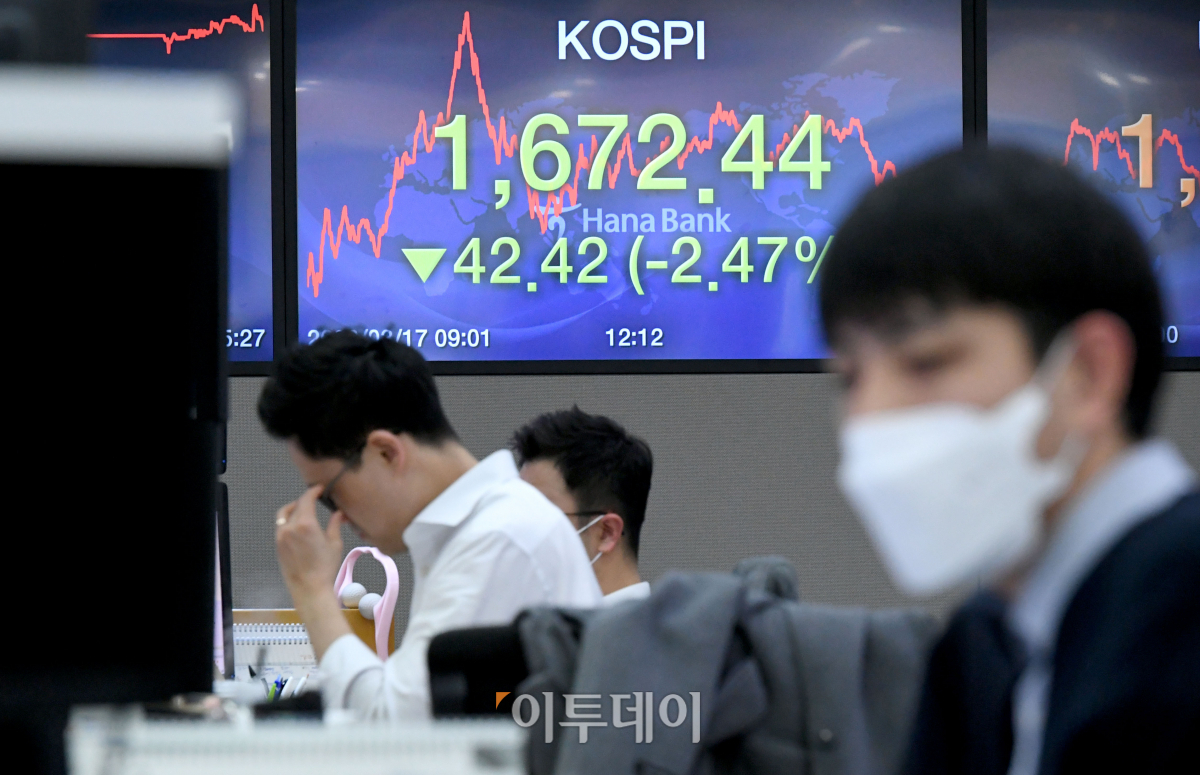 코스피가 9년여 만에 1700선 밑으로 떨어지고 원달러 환율이 약 10년 만에 가장 높은 1240원대에서 마감했다. 17일 서울 중구 하나은행 딜링룸 전광판에 코스피 지수가 전 거래일보다 42.42포인트(2.47%) 내린 1672.44를 가리키고 있다. 이날 원달러 환율은 전 거래일보다 17.5원 오른 1243.5원에 거래를 마쳤으며, 종가 기준 코스피지수 1700선이 붕괴된 것은 2011년 10월 5일(1666.52) 이후 약 9년 만이며 원달러 환율 종가가 1240원대를 기록한 것은 2010년 6월 11일(1246.1원) 이후 약 10년 만에 처음이다.