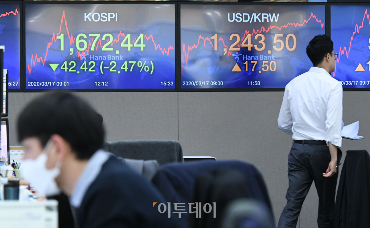 코스피가 9년여 만에 1700선 밑으로 떨어지고 원달러 환율이 약 10년 만에 가장 높은 1240원대에서 마감했다. 17일 서울 중구 하나은행 딜링룸 전광판에 코스피 지수와 환율이 전 거래일보다 42.42포인트(2.47%) 내린 1672.44와 17.5원 오른 1243.5원을 각각 가리키고 있다. 종가 기준 코스피지수 1700선이 붕괴된 것은 2011년 10월 5일(1666.52) 이후 약 9년 만이며 원달러 환율 종가가 1240원대를 기록한 것은 2010년 6월 11일(1246.1원) 이후 약 10년 만에 처음이다.