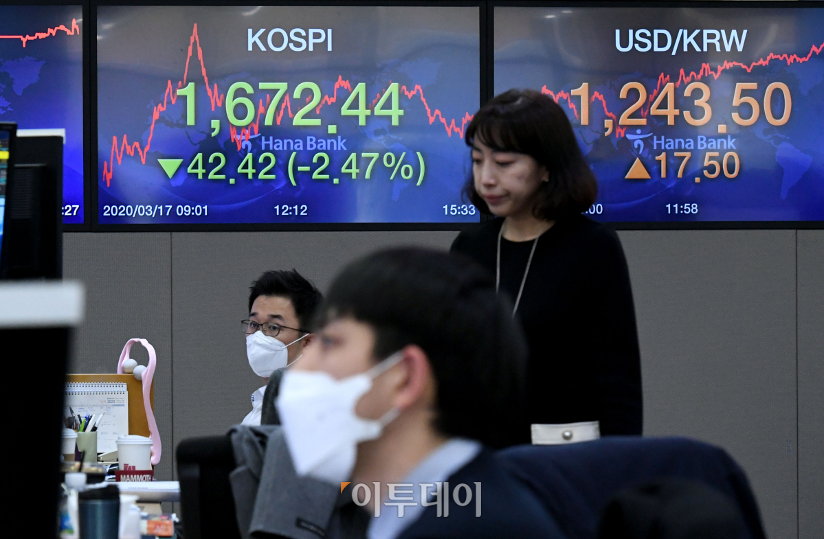 코스피가 9년여 만에 1700선 밑으로 떨어지고 원달러 환율이 약 10년 만에 가장 높은 1240원대에서 마감했다. 17일 서울 중구 하나은행 딜링룸 전광판에 코스피 지수와 환율이 전 거래일보다 42.42포인트(2.47%) 내린 1672.44와 17.5원 오른 1243.5원을 각각 가리키고 있다. 종가 기준 코스피지수 1700선이 붕괴된 것은 2011년 10월 5일(1666.52) 이후 약 9년 만이며 원달러 환율 종가가 1240원대를 기록한 것은 2010년 6월 11일(1246.1원) 이후 약 10년 만에 처음이다.