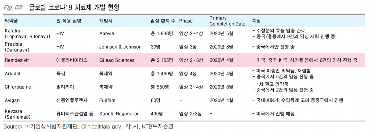 특히 “길리어드사의 ‘렘데시비르(Remdesivir)’는 가장 기대되는 후보물질로 미국, 중국, 한국 등 지역에서 6건의 임상 진행 중이며 중국 임상3상의 경우 이르면 4월 안에 데이터 발표가 기대된다”고 강조했다.
