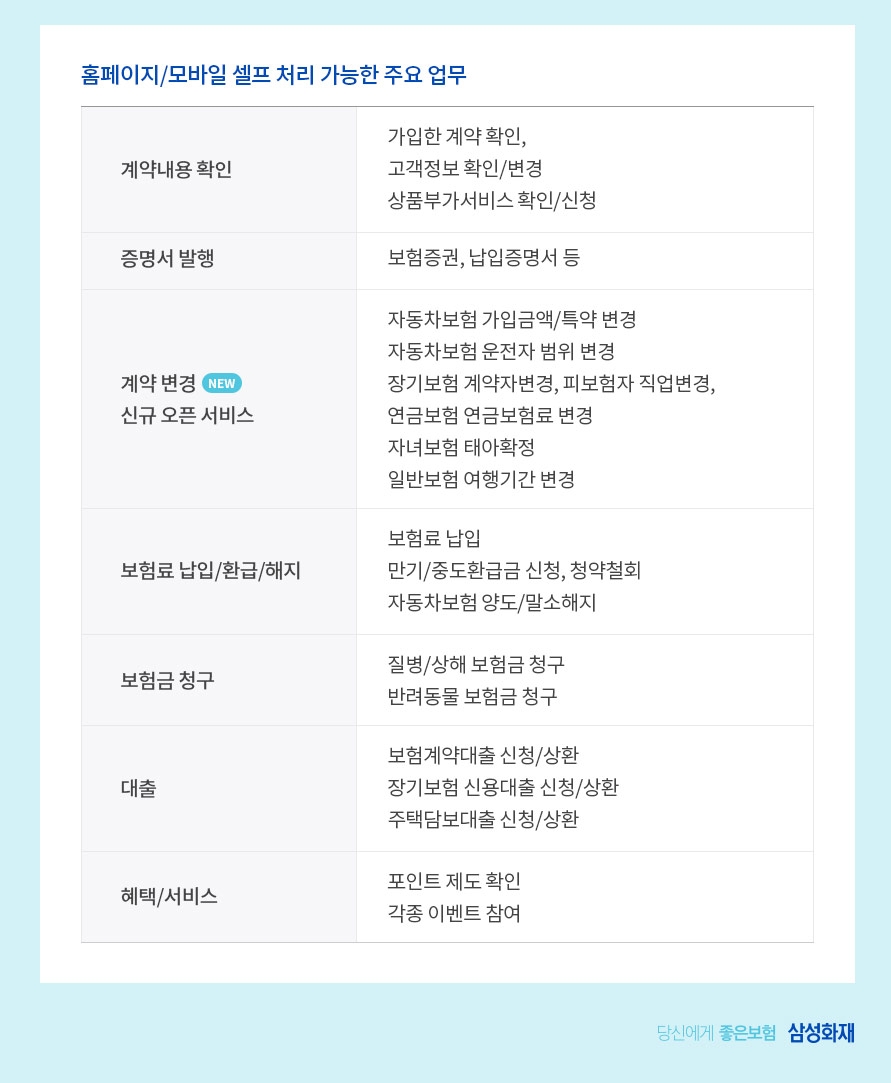 삼성화재 보험에 가입한 고객이라면 누구나 홈페이지나 모바일을 통해 △계약내용 확인 △증명서 발행 △계약변경 △보험료 납입/환급/해지 △보험금 청구 △대출 등 주요 업무를 스스로 간편하게 처리할 수 있다.