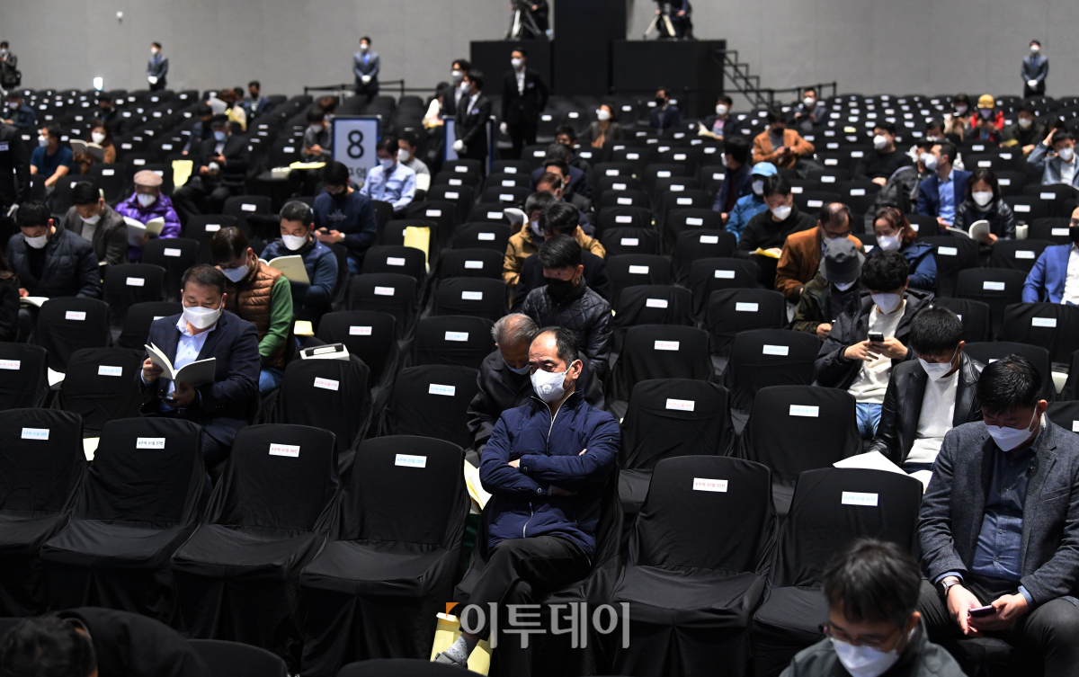 18일 경기도 수원시 수원컨벤션센터에서 삼성전자 제51기 정기주주총회가 열리고 있다. 이날 주주총회는 코로나19 예방을 위해 지정 좌석제도로 운영됐다.