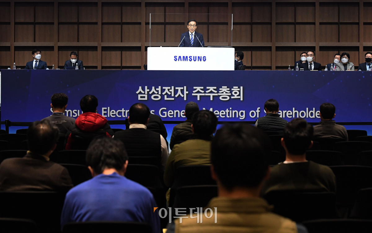 김기남 삼성전자 대표이사 부회장이 18일 경기 수원시 광교중앙로 수원컨벤션센터에서 열린 삼성전자 제51기 정기주주총회에서 발언을 하고 있다.