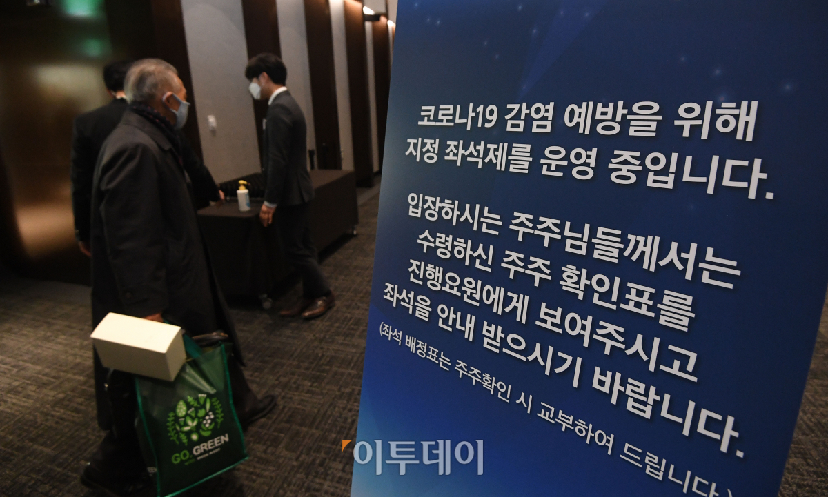 주총장 앞 입구에 크게 자리 잡은 흰색 텐트의 선별 진료소가 예년과는 다른 확연한 변화였다. 주총장 건물 각 입구에는 열화상 카메라와 손소독제가 비치됐고, 직원들은 주주들의 마스크 착용을 확인했다. 모든 출입자는 비치된 손소독제를 사용한 뒤 안내직원의 안내에 따라 개별로 체온측정을 받았다.