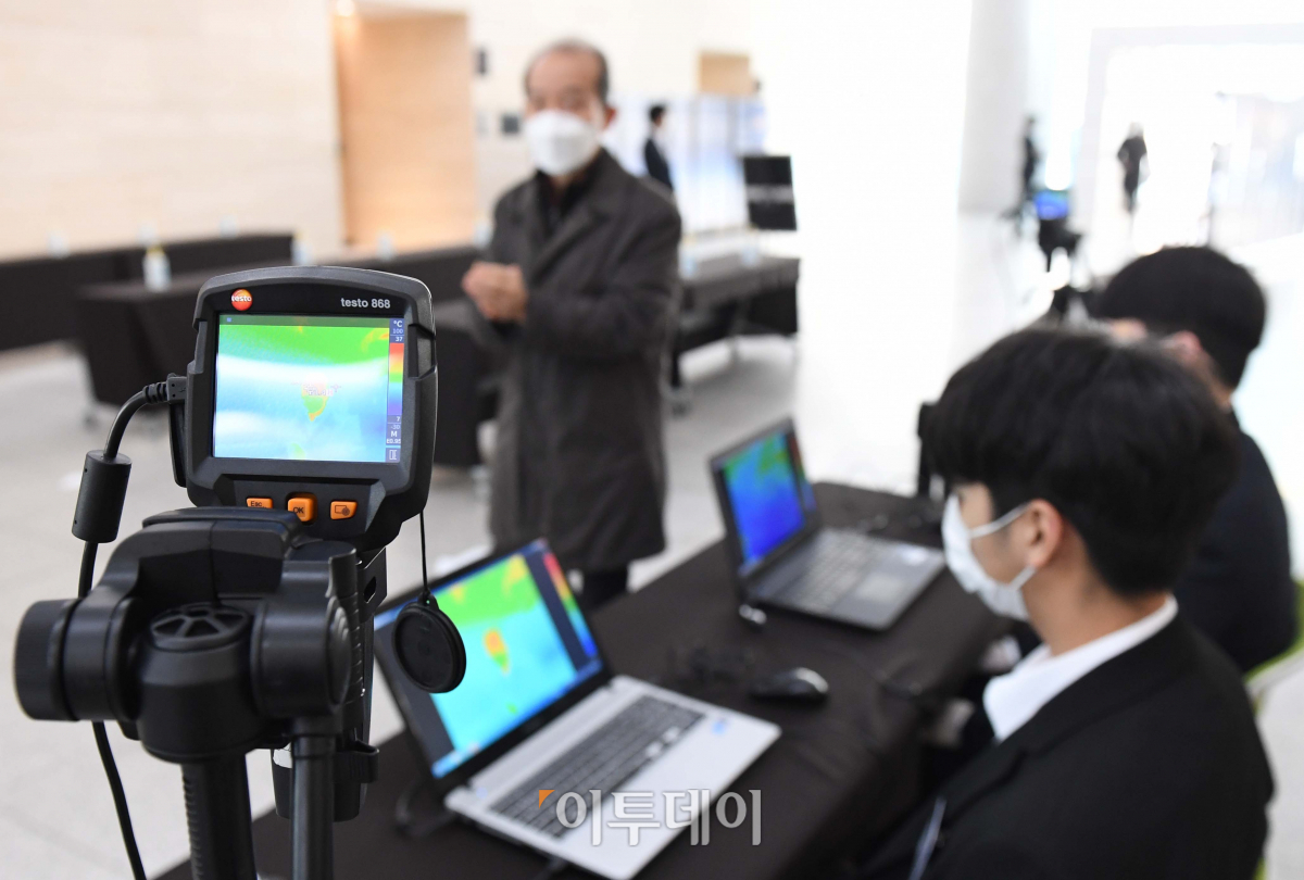 18일 경기 수원시 광교중앙로 수원컨벤션센터에서 열린 삼성전자 제51기 정기주주총회장 입구에 신종 코로나바이러스 감염증(코로나19) 확산 방지를 위한 열화상 카메라가 설치돼 있다.