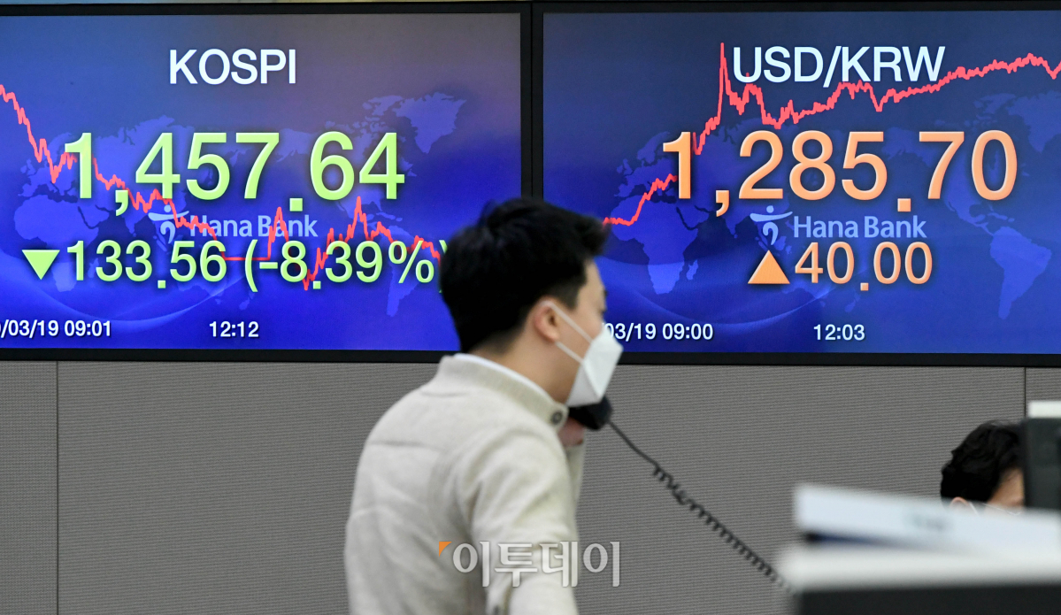 코스피가 급락세를 지속하면서 10년 8개월만에 1500선이 붕괴됐다. 코스닥은 11%대 급락했으며 원·달러 환율은 급등해 1300원 선에 다가섰다. 19일 서울 중구 하나은행 딜링룸에서 직원들이 업무를 보고 있다. 이날 코스피는 전 거래일보다 133.56포인트(8.39%) 내린 1457.64, 원·달러 환율은 40.00원 오른 1285.70, 코스닥은 56.79포인트(11.71%) 내린 428.35로 장을 마쳤다.
