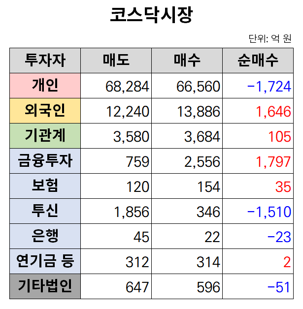 이날 개인은 홀로 1724억 원어치를 순매도했다. 반면 외국인과 기관은 각각 1646억 원, 105억 원어치를 사들였다.