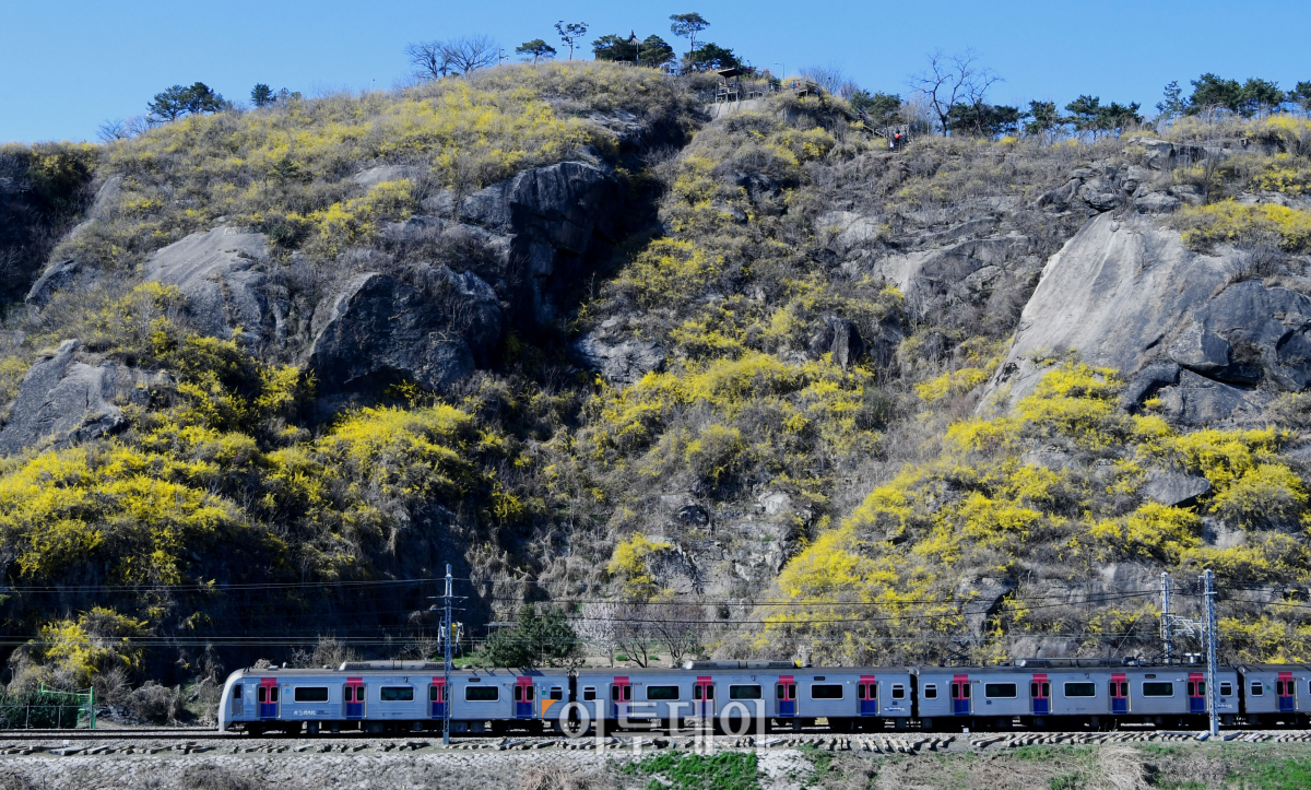 전국이 완연한 봄 날씨를 보인 22일 서울 성동구 응봉산에 만개한 개나리가 계절의 정취를 전하고 있다.