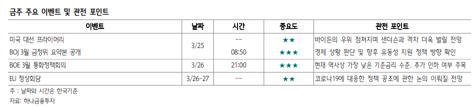 이어 “이번 주 발표되는 미국 3월 IHS 마킷 제조업 및 서비스업 구매관리자지수(PMI)는 시장 전망치를 밑돌 개연성이 크다”고 전망했다.