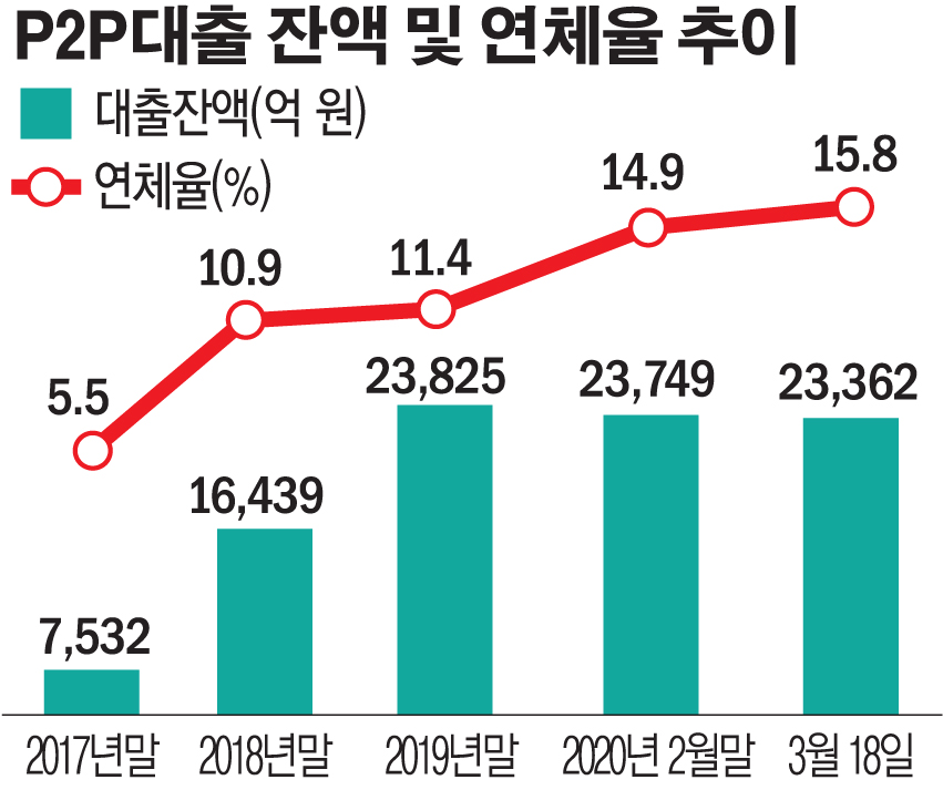 지난해 말 11.4%이던 P2P 대출 연체율은 올해 2월 말 14.9%, 이달 18일 기준으로 15.8%까지 오른 상태다.