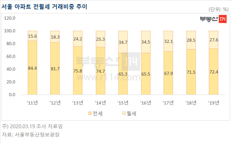 서울부동산정보광장에 따르면 지난해 서울 시내에서 체결된 아파트 전·월세 계약은 17만2950건이다. 이 가운데 72.4%(12만5071건)가 전세 계약이다. 전세 거래가 바닥을 쳤던 2015년(65.3%)과 비교해 전세 비중이 7.1%포인트 늘었다. 2015년엔 전체 전·월세 계약 15만7253건 중 전세 거래가 10만2630건이었다.
