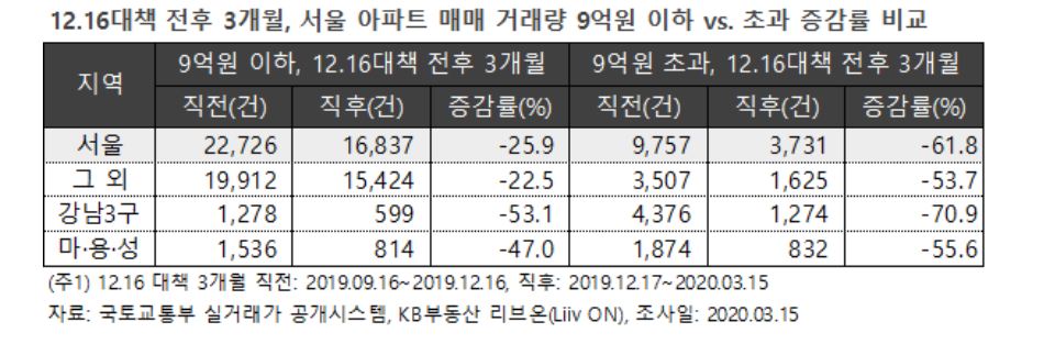 KB부동산 리브온(Liiv ON)이 12.16대책 전후 3개월 대비 가격대별 아파트 매매거래량 증감률을 분석한 결과 서울 9억 원 초과 아파트의 실거래 신고건수는 3731건으로 대책 직전 3개월(9757건) 대비 61%(6026건) 줄었다. 이는 거래가격 9억 원 이하 감소폭 대비 2.3배 큰 수치다.