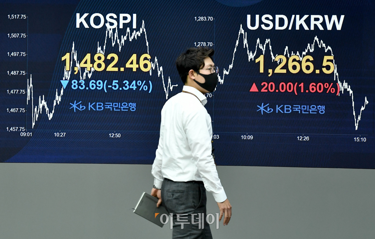 코스피가 외인과 기관의 매도세에 1490선을 밑돌며 거래를 마쳤다. 23일 서울 여의도 KB국민은행 스마트딜링룸에서 직원들이 업무를 보고 있다. 이날 코스피는 전 거래일보다 83.69포인트(5.34%) 내린 1482.46, 원·달러 환율은 20.00원(1.60%) 오른 1266.50, 코스닥은 23.99포인트(5.13%) 내린 443.76으로 마감했다.