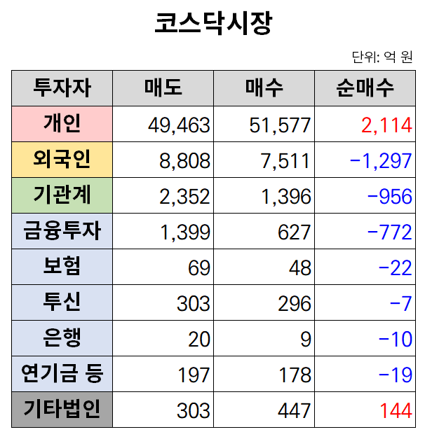 이날 외국인과 기관은 각각 1297억 원, 956억 원어치를 순매도하며 지수 하락을 이끌었다. 반면 개인은 홀로 2114억 원어치를 사들였다.