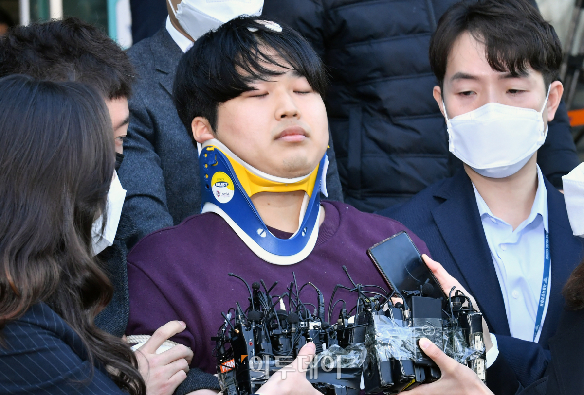 여성을 협박해 성 착취 불법 촬영물을 제작하고 유포한 텔레그램 ‘박사방’ 운영자 조주빈이 25일 서울 종로경찰서에서 검찰 송치를 위해 나서고 있다.