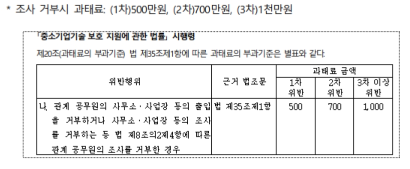 중기부는 외부전문가(기술침해자문단)와 법리 검토 끝에 연구소에 대해 현장조사를 거부한 대웅제약의 행위를 1차 거부로 보고 500만 원의 과태료를 부과하기로 했다. 중소기업기술보호법 제20조 35조 제1항에 따라 1차 조사 거부는 500만 원, 2차는 700만 원, 3차는 1000만 원이다.