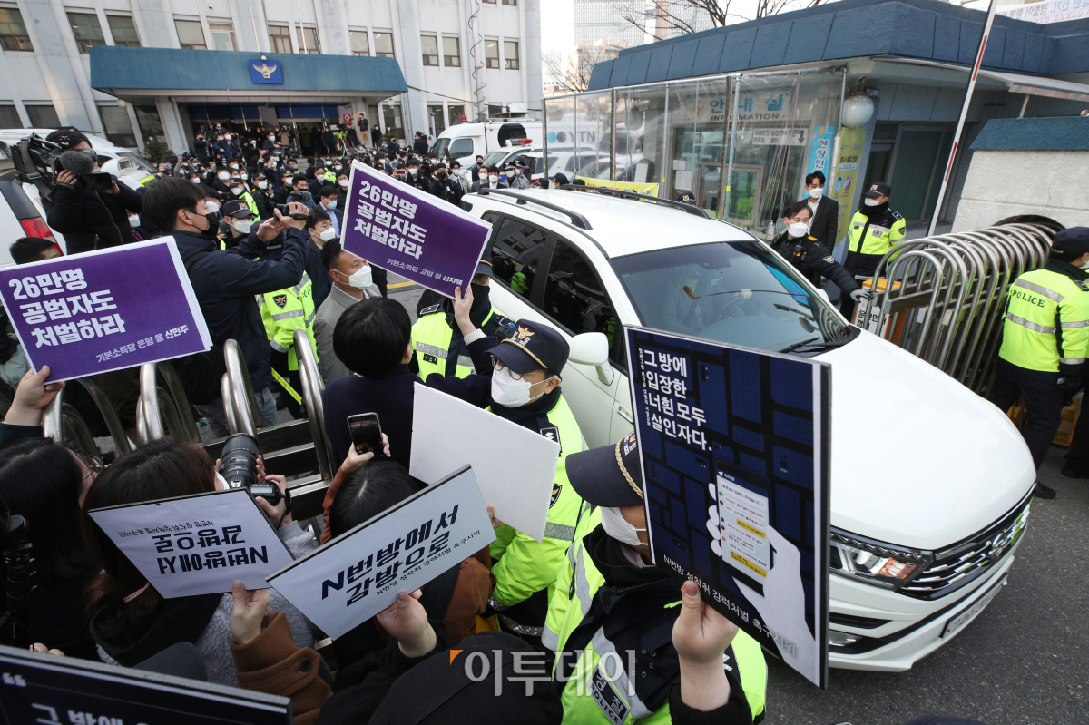25일 인터넷 메신저 텔레그램에서 미성년자를 포함한 여성들의 성 착취물을 제작 및 유포한 혐의를 받는 '박사방' 운영자 조주빈(25)이 탄 차량이 서울 종로경찰서를 나와 검찰 유치장으로 향하자 기본소득당 관계자와 시민들이 조주빈의 강력처벌을 촉구하며 피켓시위를 하고 있다.