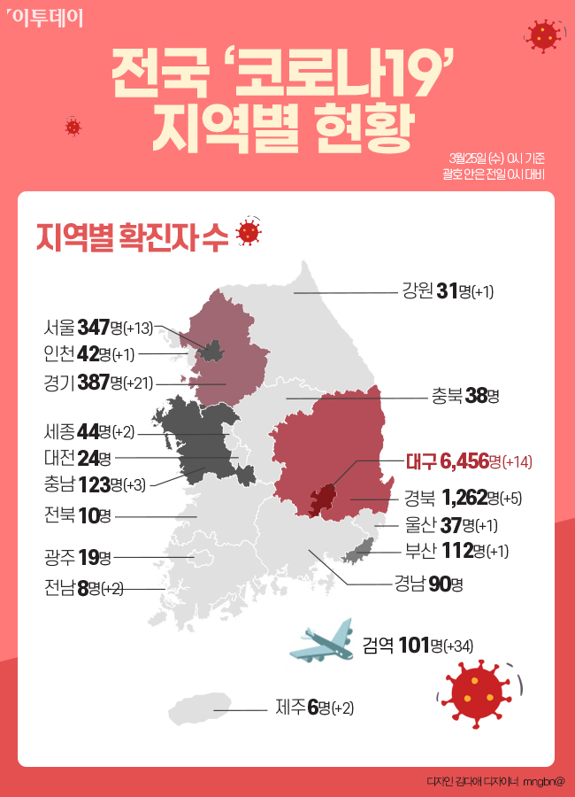 '코로나19' 일일 신규 확진자 수가 다시 세자릿 수를 보이며 확산하고 있다. 전국에선 24일 하루 동안 총 100명의 '코로나19' 확진자가 추가 확인되면서 국내 '코로나19' 총 확진자 수는 9137명이 됐다. 이 중 대구·경북 확진자만 전체 확진자의 84.5%에 달한다.