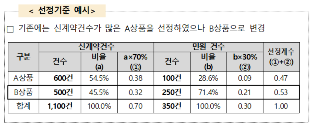 평가대상상품 선정기준에 민원발생 건수도 반영되도록 개선한다. 종전에는 1년 신규 판매량 상위 상품(회사별, 상품군별)을 선정했지만, 신계약건수 비율과 민원건수 비율을 7 : 3으로 반영해 최종선정계수를 산정 후 평가위원회가 선정하도록 한다.