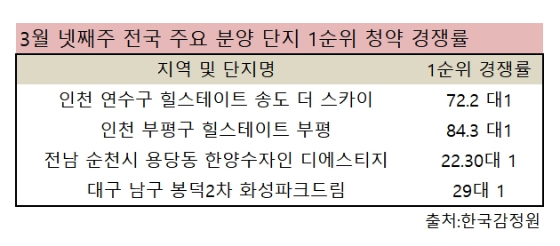 25일 한국감정원 청약홈에 따르면 전날 1순위 청약을 진행한 인천 연수구 '힐스테이트 송도 더 스카이'는 804가구 모집에 5만8021명의 청약자가 몰려들었다. 평균 72.2 대 1의 경쟁률이다. 최고 경쟁률은 352.9대 1(전용 84㎡B)에 달했다. 54가구 모집에 해당지역에서만 무려 9530명이 몰렸다.