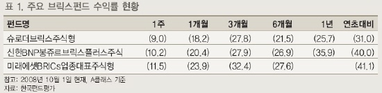 펀드별로 살펴보면, '슈로더브릭스주식형'의 연초이후 수익률은 -31.0%, '신한BNP봉쥬르브릭스플러스주식' -40.0%, '미래에셋BRICs업종대표주식형' -41.1%를 기록중이다.