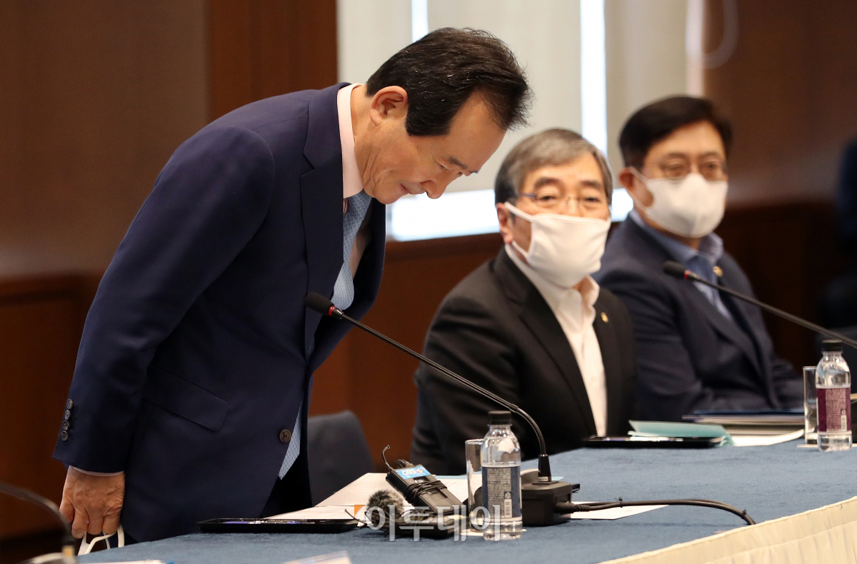 정세균 국무총리가 25일 서울 중구 은행회관에서 열린 코로나19 위기극복을 위한 금융지원 간담회 및 협약식에서 인사하고 있다.