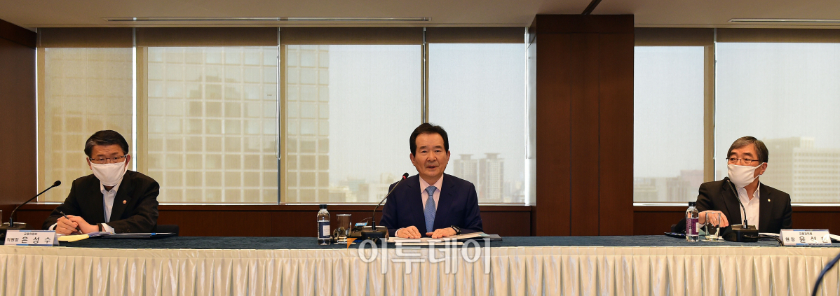 정세균 국무총리가 25일 서울 중구 은행회관에서 열린 코로나19 위기극복을 위한 금융지원 간담회 및 협약식에서 모두발언을 하고 있다.