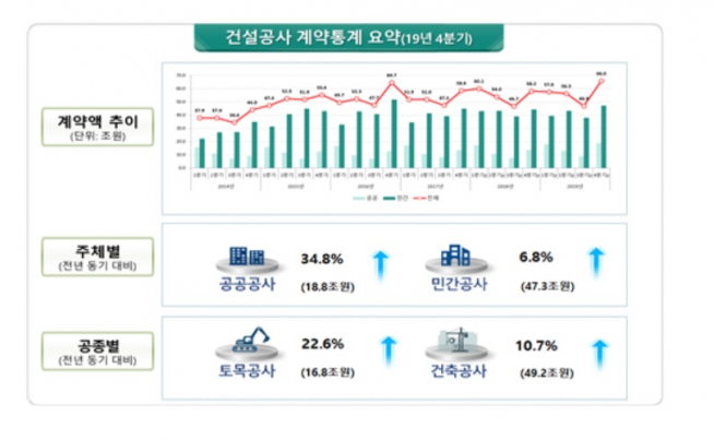 공공과 민간공사 모두 증가한 가운데 4분기 공공공사 계약액은 18조8000억 원으로 전년 동기 대비 34.8% 증가, 연간으로는 58조8000억 원으로 전년 대비 19.2% 늘었다.