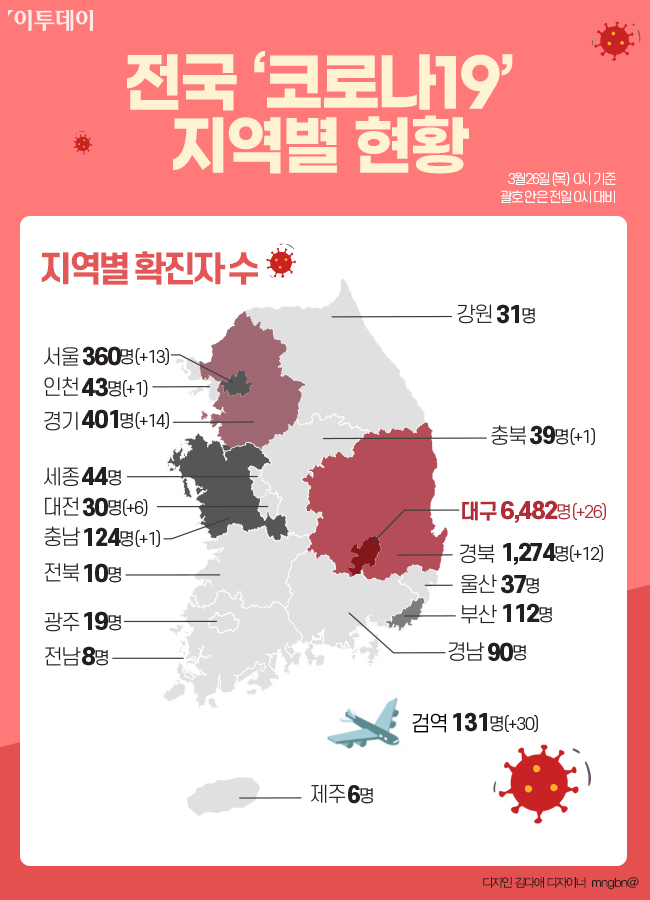 이로써 전국 시·도별 '코로나19' 확진자 수는 △대구 6482명 △경북 1274명으로 가장 많은 비중을 차지했다. 이어 △경기 401명 △서울 360명 △검역소 131명 △충남 124명 △부산 112명 △경남 90명 △세종 44명 △인천 43명 △충북 39명 △울산 37명 △강원 31명 △대전 30명 △광주 19명 △전북 10명 △전남 8명 △제주 6명 순으로 나타났다.