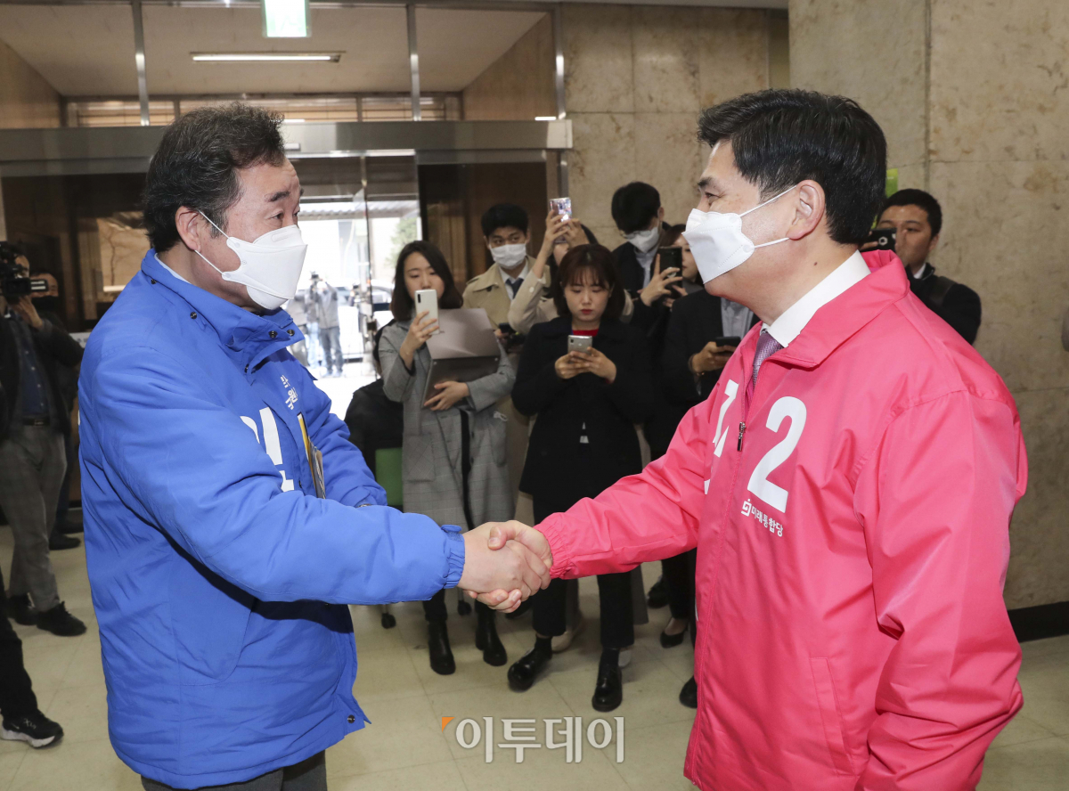 21대 총선에서 서울 종로에 출마하는 이낙연 더불어민주당 후보가 26일 서울 종로구선거관리위원회에서 후보자 등록에 앞서 중구에 출마하는 지상욱 미래통합당 후보와 악수하고 있다.