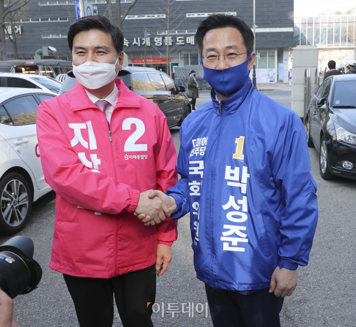 21대 총선에서 서울 중구에 출마하는 박성준 더불어민주당 후보와 지상욱 미래통합당 후보가 26일 서울 중구선거관리위원회에서 후보자 등록에 앞서 악수하고 있다.