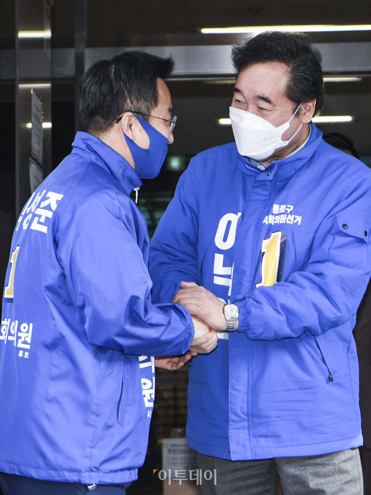 21대 총선에서 서울 종로에 출마하는 이낙연 더불어민주당 후보가 26일 서울 종로구선거관리위원회에서 후보자 등록을 마친 뒤 중구에 출마하는 박성준 민주당 후보와 인사하고 있다.